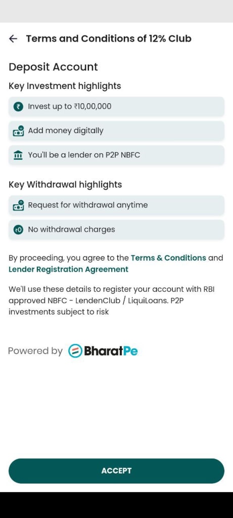 12% club Bharat pay का ही एक पार्ट है जिसकी मदद से आप पैसे उधार दे और ले सकते है यानि की एक टाइम पे आप borrower या lander बन सकते है।