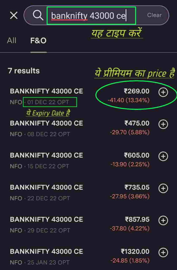 इसके लिए आप अपनी ब्रोकर ऐप में F&O वाले सेक्शन में जाकर type करेंगे ‘BANKNIFTY 43000 CE’