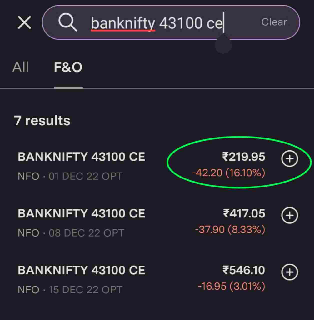 इसके लिए आप अपनी ब्रोकर ऐप में F&O वाले सेक्शन में जाकर type करेंगे ‘BANKNIFTY 43000 CE’