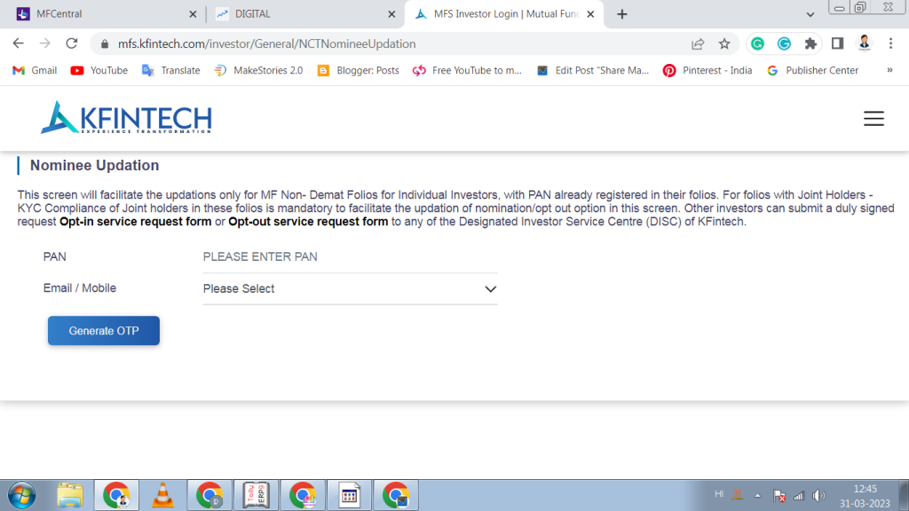KFINTECH की साइट https://mfs.kfintech.com/investor/General/NCTNomineeUpdation की साइट मे जाके आप जरूरी डीटेल देके Nominee add कर सकते है नीचे आप फोटो मे देख सकते है की कैसा screen खोलेगा।